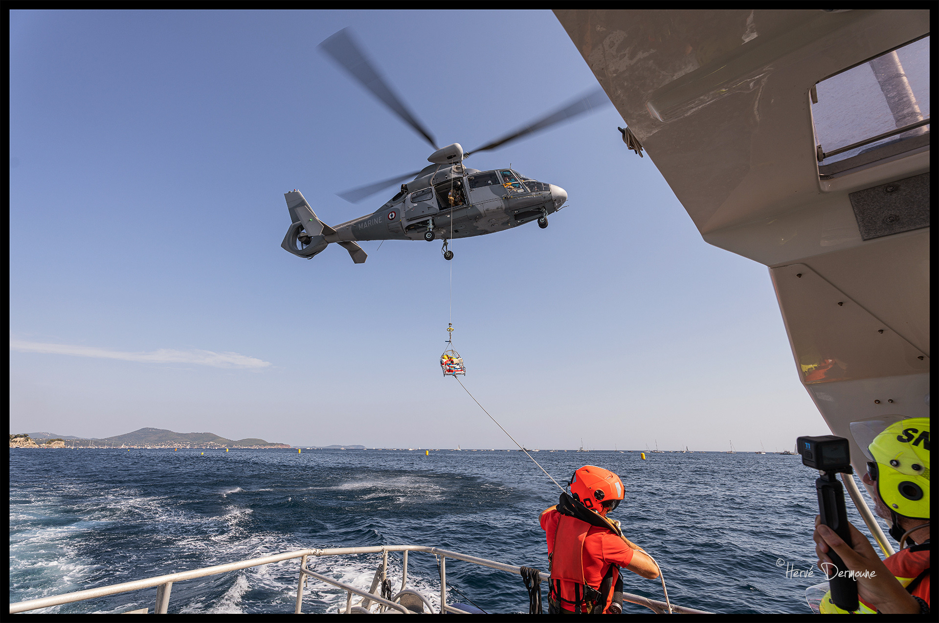 On commence par la traditionnelle démonstration d'hélitreuillage entre un hélicoptère de l'aéronautique navale de Hyères, ici un Dauphin de la flottille 35F et la vedette de la SNSM.